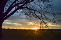 Zonsopkomst in Noord-Brabant in Nederland. Door het fotograferen met de boom op de voorgrond, krijgt de foto meer diepte. De lensflare, de gekleurde bollen, in de foto geven de foto extra sfeer. Deze lensflare wordt veroorzaakt door een interne reflectie in het objectief.