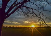 Zonsopkomst in Noord-Brabant in Nederland. Door het fotograferen met de boom op de voorgrond, krijgt de foto meer diepte. De lensflare, de gekleurde bollen, in de foto geven de foto extra sfeer. Deze lensflare wordt veroorzaakt door een interne reflectie in het objectief.