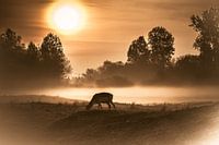 Landschap in de mist met damhert op de voorgrond bij zonsopkomst