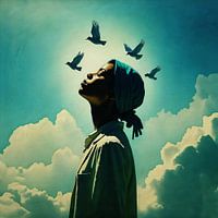 Dit schilderij, "Zorgen vliegen weg", nodigt kijkers uit in een sereen moment van reflectie en hoop. De centrale figuur, badend in zacht licht, kijkt omhoog met een uitdrukking van kalme introspectie, terwijl vogels boven haar cirkelen, symbool voor vrijheid en bevrijding van lasten. De lucht, geschilderd in rijke blauwe tinten, dient…
