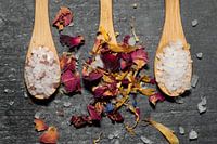 Drie houten lepels liggen naast elkaar. In elke lepel zit zout. Elk zout heeft een andere herkomst en een ander uiterlijk. Gedroogde bloemblaadjes zijn verspreid over de zoutkorrels in het midden.