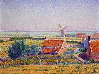 Stadsgezicht en skyline van het dorp Zoutelande op Walcheren in Zeeland. Voor een woning met akkerland en een moestuin. Achter de molen.