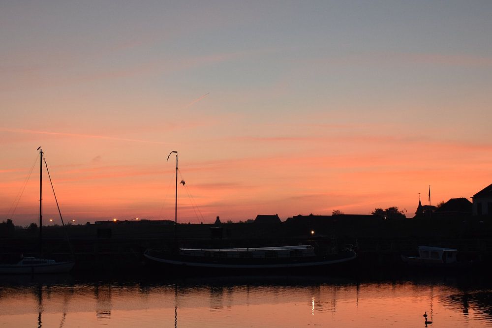De laatste mooie dagen van augustus kondigen zich aan in de Zooutkamper haven met een prachtige roodachtige zonsopgang. Het water is zo glad dat het ervoor zorgt dat waterspiegels eruit zien als een optische illusie. 'S Ochtends vroeg is het mooiste en prachtigste moment van de dag.