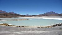 Een groen kleuring zoutmeer op grote hoogte boven de 4000m in Bolivia, Zuid-Amerika. Bergen op de achtergrond.