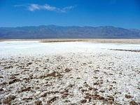 De oneindige grote zoutvlakte in de woestijn met hoge temperaturen in de Death Valley van Noord- Amerika.