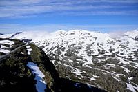 Zoveel sneeuw nog op de berg Dalsnibba bij het plaatsje Geiranger in Noorwegen. Omdat het al begin juni is, vermoedden we dat de sneeuw hier waarschijnlijk nooit echt zal verdwijnen.