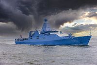 Marineschepen van de koninklijke marine op volle zee met een onweersbui op de achtergrond,