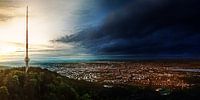 Beeldmontage: Uitzicht vanaf de Uetliberg over Zürich tijdens de overgang van dag naar nacht.