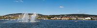 Zürich Switzerland Under azure blue skies a fountain spews water into the Zürichsee on a fine autumn day. Stitched panorama