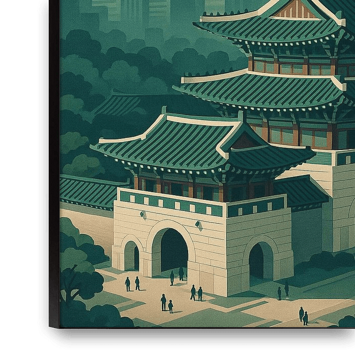 Deze Zuid-Koreaanse art-decoposter toont de balans tussen erfgoed en innovatie, met het historische Gyeongbokgung Paleis tegen de strakke skyline van Seoul en de Namsan Toren. Stralen van avondlicht verspreiden zich over de stad en symboliseren de harmonie tussen verleden en vooruitgang.