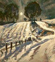 Zie het stijkende volle maanlicht over een besneeuwde akker in Zuid-Limburg. Met speciale dank aan Fred Fouarge die mij toestemming verleende om zijn foto te vertalen naar een schilderij. Het origineel schilderij is te koop. www.briex.eu