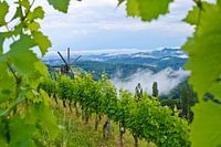Een Klapotetz midden in het heuvellandschap van de Zuid-Stiermarken op een regenachtige middag. (Een Klapotetz is een veel voorkomende vogelverschrikker in het Zuid-Stiermarkse wijnland).