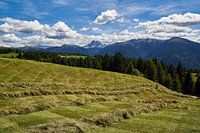 Op de Rodenecker Alm in de Lüsner bergen. Hooi wordt met de hand gedraaid met het oog op de Peitlerkofel.