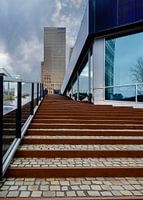 Een bijzonder zicht op de Symphony gebouw op de Zuidas in Amsterdam, gezien vanaf de binnenplaats van het naastgelegen pand. Vanwege de toegepaste focus techniek is de scherptediepte enorm en wordt bovendien verscherpt door de haast oneindig lijkende trap. Dit werk is uitermate geschikt als fotobehang, bijvoorbeeld in een hal of welkom…