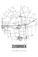 Zwart-witte landkaart, stratenplan of plattegrond van Zuidbroek. Zuidbroek is gelegen in de gemeente Midden-Groningen, provincie Groningen. Op de stadskaart zijn alle openbare wegen in Zuidbroek opgenomen. Verder is de kaart voorzien van de coördinaten van het centrum van Zuidbroek.