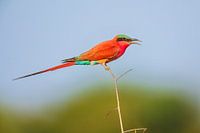 Dit werk is een close-up van een Zuidelijke karmijnrode bijeneter (Merops nubicoides) zittend of wellicht beter omschreven als balancerend op een takje. Het felgekleurde vogeltje steekt fraai af tegen de vage achtergrond, gevormd door struikgewas en een blauwe lucht. De foto werd gemaakt in het Bwabwata nationale park in het noorden van Namibië