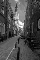 Dit beeld toont van Zandstraat in Amsterdam. Het is een smalle straat waarin aan de linkerkant de Zuiderkant zich magistraal toont. De Zuiderkerk was de eerste protestantse kerk in Amsterdam. Het gebouw is van de hand van de beroemde architect Hendrick de Keyzer en is gebouwd tussen 1601 en 1611. Dit werk is ook in kleur verkrijgbaar.