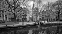 De Zuiderkerk torent uit boven de grachtenpanden aan de Kloveniersburgwal in Amsterdam. In de gracht liggen 2 woonboten afgemeerd.