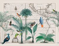 Palmbomen en vogels op een historische kaart van de Zuidzee met Noord- en Zuid-Amerika, perfect voor reizigers, avonturiers, ontdekkingsreizigers en iedereen die last heeft van reislust