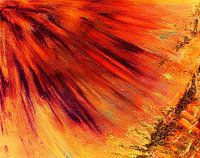Een acrylschilderij met oranje zuiveringsstralen, helende stralen, die uit de hemel neerdalen, alle negativiteit verwijderen en ons allen met vreugde vervullen.
