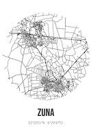 Zwart-witte landkaart, stratenplan of plattegrond van Zuna. Zuna is gelegen in Twente, in de gemeente Wierden, provincie Overijssel. Op de stadskaart zijn alle openbare wegen in Zuna opgenomen. Verder is de kaart voorzien van de coördinaten van het centrum van Zuna.