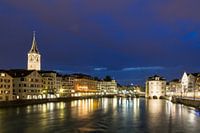 Prachtige opname van de stad Zurich, Zwitserland, met St.Peter kerktoren, stadhuis en de rivier de Limmat in de zomer tijdens het blauwe uur in de avond met verlichte gebouwen