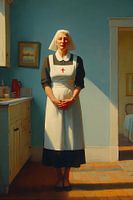 De zus staat stil in het kader van de kamer - een figuur in het wit, omlijst door bleke kleuren en hard licht, gevangen in de stijl van Edward Hopper. Haar houding is rechtop, maar zonder doel. Haar blik is recht vooruit, ergens tussen plicht en verlies van gedachten. Haar handen liggen gevouwen voor haar, alsof ze herinneringen…