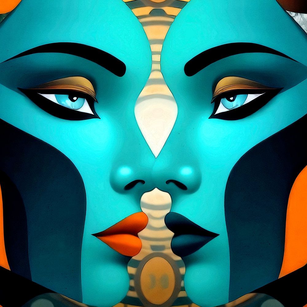 Een fascinerend digitaal kunstwerk dat de spanning en harmonie tussen gespiegelde identiteiten verkent. Twee gestileerde portretten van vrouwen in levendig turquoise, oranje, zwart en wit staan symmetrisch tegenover elkaar. Hun amandelvormige ogen, prominente jukbeenderen en geometrische contouren stralen surrealistische elegantie en emotionele diepte uit.