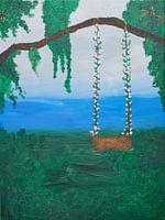 Schilderij in kleur van een acrylschilderij op doek, bruine schommel hangend aan een tak boven een meer