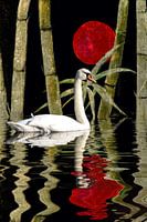 Collage van aquarel en fotografie , witte zwaan , watervogel , bamboe, rode maan , collage van fotografie en schilderkunst , Rode Maan in bamboe ( aquarel 2009) ,