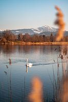 Zwaan aan het Sulzberger meer in de avond met de Grünten op de achtergrond