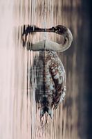 Deze prachtige foto toont een zwaan die sierlijk door het water glijdt, waarbij haar gebogen hals en reflectie samen een subtiele hartvorm creëren. Het delicate licht dat op het water weerkaatst, geeft een kalmerende sfeer en brengt een moment van sereniteit over. De bruinige, aardse tinten van de zwaan en het rustige wateroppervlak stralen rust en eenvoud uit. Het kantelen van de foto voegt een uniek perspectief toe, waardoor de zwaan in perfecte symmetrie met haar reflectie is verbonden.