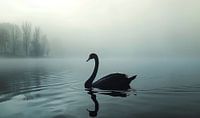 Dit kunstwerk toont een serene en mystieke scène van een zwarte zwaan die rustig over een mistig meer glijdt. De zwaan bevindt zich in de voorgrond en wordt prachtig weerspiegeld op het gladde wateroppervlak. De dikke mist die het meer en de omliggende bomen omhult, geeft het tafereel een dromerige en etherische sfeer. De achtergrond is…
