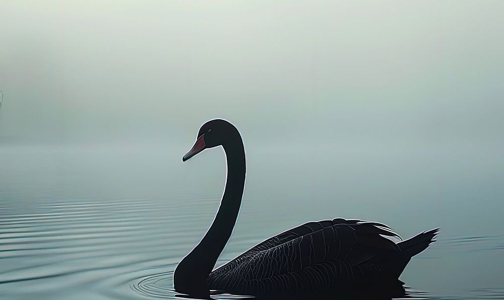 Dit kunstwerk toont een serene en mystieke scène van een zwarte zwaan die rustig over een mistig meer glijdt. De zwaan bevindt zich in de voorgrond en wordt prachtig weerspiegeld op het gladde wateroppervlak. De dikke mist die het meer en de omliggende bomen omhult, geeft het tafereel een dromerige en etherische sfeer. De achtergrond is bijna onzichtbaar door de nevel, waardoor de focus volledig op de zwaan ligt en haar gracieuze bewegingen door het water.