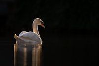 Een zwaan in rustig water waar weinig licht is en een zeer serene sfeer geeft. het randje licht om de contouren van de zwaan maken het geheel af. Het wit van de zwaan komt mooi uit in de donkere achtergrond.