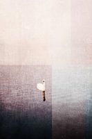 Kunstwerk van een foto van een zwaan in het water met kleurrijke vlakken in pasteltinten zoals roze, oranje, lila, blauw en grijs.