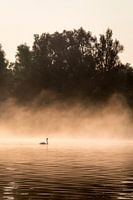 Prachtige zonsopkomst met lage mist boven het water. Al varend door de Biesbosch kwam de zon op. De zwanen glijden over het water. Geen wolkje in de lucht. Prachtige natuur in dit natuurgebied in Brabant (Nederland).