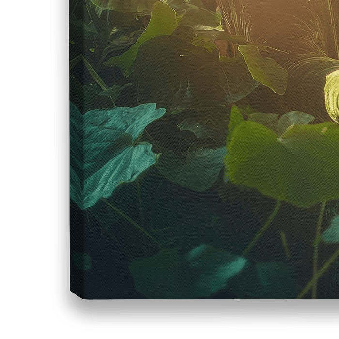 Een majestueuze zwaan rust ontspannen uit op een elegante, groene sofa, ingebed in een betoverend spel van licht en schaduw. Omringd door weelderig gebladerte en oude boeken straalt het tafereel een vredige harmonie uit. Dit kunstwerk geeft een speciaal tintje aan elke woonkamer en combineert rust en elegantie perfect.