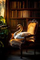 Een elegante zwaan troont in warm licht op een weelderige, antieke fauteuil, omgeven door een stilte die verhalen fluistert. De harmonieuze combinatie van natuur en klassiek design creëert een idyllische sfeer, perfect voor een woonkamer waarin kunst en gezelligheid onbeperkt naast elkaar bestaan.