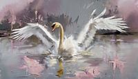 Een kunstwerk van een zwaan die haar vleugels spreidt om op te vliegen. Kunstwerk gemaakt met digitale technieken, ai in combinatie met digitaal schilderen. Het werk is uitgevoerd in wit grijs en roze tinten. Het werk heeft een lang en smal liggend formaat en past daardoor perfect boven de bank.