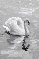 Dit schilderachtige ontwerp toont een prachtige, witte zwaan die sierlijk over het water glijdt. De subtiele penseelstreken en monochrome kleurstelling geven het werk een rustige, klassieke uitstraling. Perfect voor liefhebbers van natuur en minimalistische kunst, dit ontwerp past moeiteloos in een modern interieur, zoals een woonkamer of eetkamer. De reflectie van de zwaan op het water voegt diepte toe en benadrukt de sereniteit van het tafereel. Een tijdloze keuze voor een verfijnde sfeer.