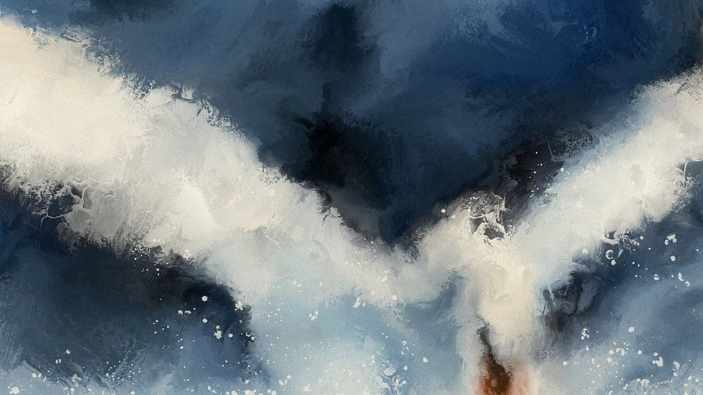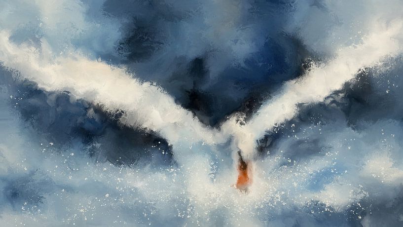 Dit werk, dat een vluchtig moment weergeeft, suggereert een zwaan die tevoorschijn komt uit een zee van diepe en lichte blauwtinten. De vleugels lijken zich midden in de vlucht te openen en op te gaan in nevelige lagen die de grens tussen vorm en sfeer doen vervagen.