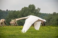 Zwaan in vlucht bij de blauwe kamer in Gelderland