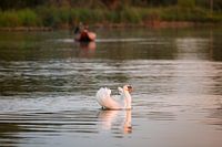 Een mooie zomeravond aan de IJssel, een zwaan die voorbijglijdt, daarachter een bootje met 2 vissers. Rust en natuurbeleving.