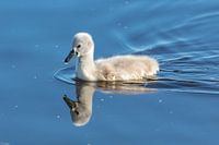 Een schattig zwaan kuiken weerspiegeld in het blauwe water van een meer
