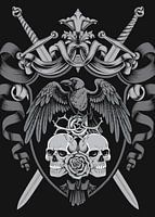 Een krachtig embleem toont een raaf zittend op twee schedels, omringd door een decoratief schild met gekruiste zwaarden en een roos. De gedetailleerde, monochrome afbeelding combineert gotische en middeleeuwse symbolen die kracht en vergankelijkheid belichamen.