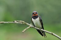 Boerenzwaluw op een takje met spinnenweb tegen een zacht groene achtergrond.