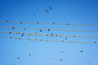 Zwerm zwaluwen proberen om te landen en te zitten op de stroomkabels. Hoogstwaarschijnlijk zijn ze aan het verzamelen om hun nieuwe reis, migratie, te starten.