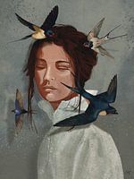 Een sfeervolle illustratie van een vrouw omringd door zwaluwen, symbool voor vrijheid, hoop en beweging. De vogels lijken haar gedachten te verbeelden: licht, ongrijpbaar en altijd in beweging. De serene uitstraling van de vrouw contrasteert met de dynamiek van de zwaluwen en creëert een gevoel van innerlijke rust én verlangen naar…