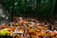 Herfstbladeren in het zonlicht met kleine paddenstoel. Kleurrijke herfst scene in een herfstbos op de Veluwe met piepkleine zwam in het zonlicht tussen het kleurrijke herfstbos